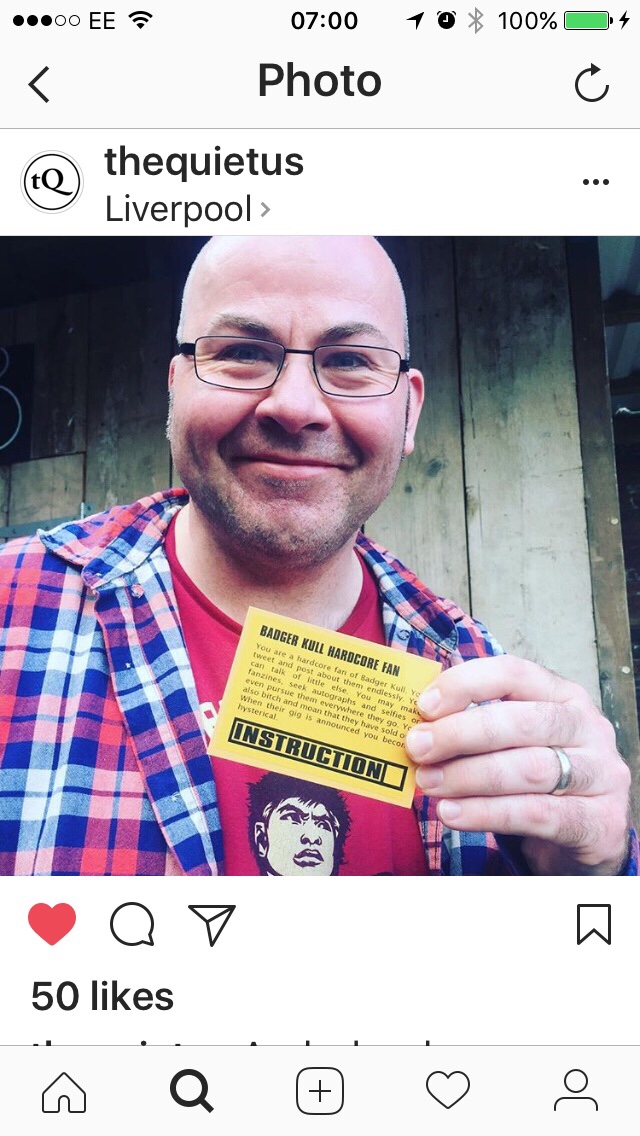 Within minutes, I had created a fan book fan page and had spammed all the relevant Facebook groups along with hundreds of my bemused friends and family. Paul, a fellow freshly appointed Hardcore Fan became my first follower and he was immediately afforded admin privileges and slowly our message spread. For a while, our little circle included the Legendary Vicky Pea – who I may have persuaded to get a BK tattoo – and Patrick Clarke, from The Quietus, who added my picture to their Instagram Feed, whilst taking time off from his Dead Perch Menace duties.