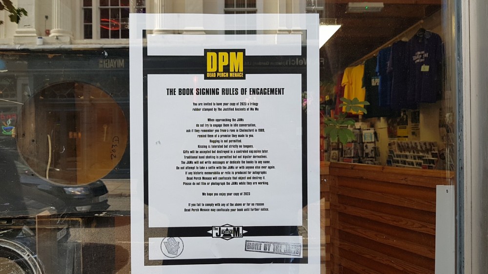 A book signing stamping sounded intriguing. We’re going to meet Them, aren’t we. I cancelled my Amazaba order, but then forgot to order my copy until the day of the journey up. I’d stopped at services, somewhere along the A50 and checked into the Facebook group we now know as The 400: Don’t Be Afraid. Back then it was called The Big Liverpool JAMs Adventure, or something approximating those words. There were rumours that the book was running out. I rang The News From Nowhere. They sounded stressed. A voice away from the phone said ‘Reserve that one and then that’s it’. I gave my card details and secured my copy. A few days later it was in BBC Breakfast News being stamped.
