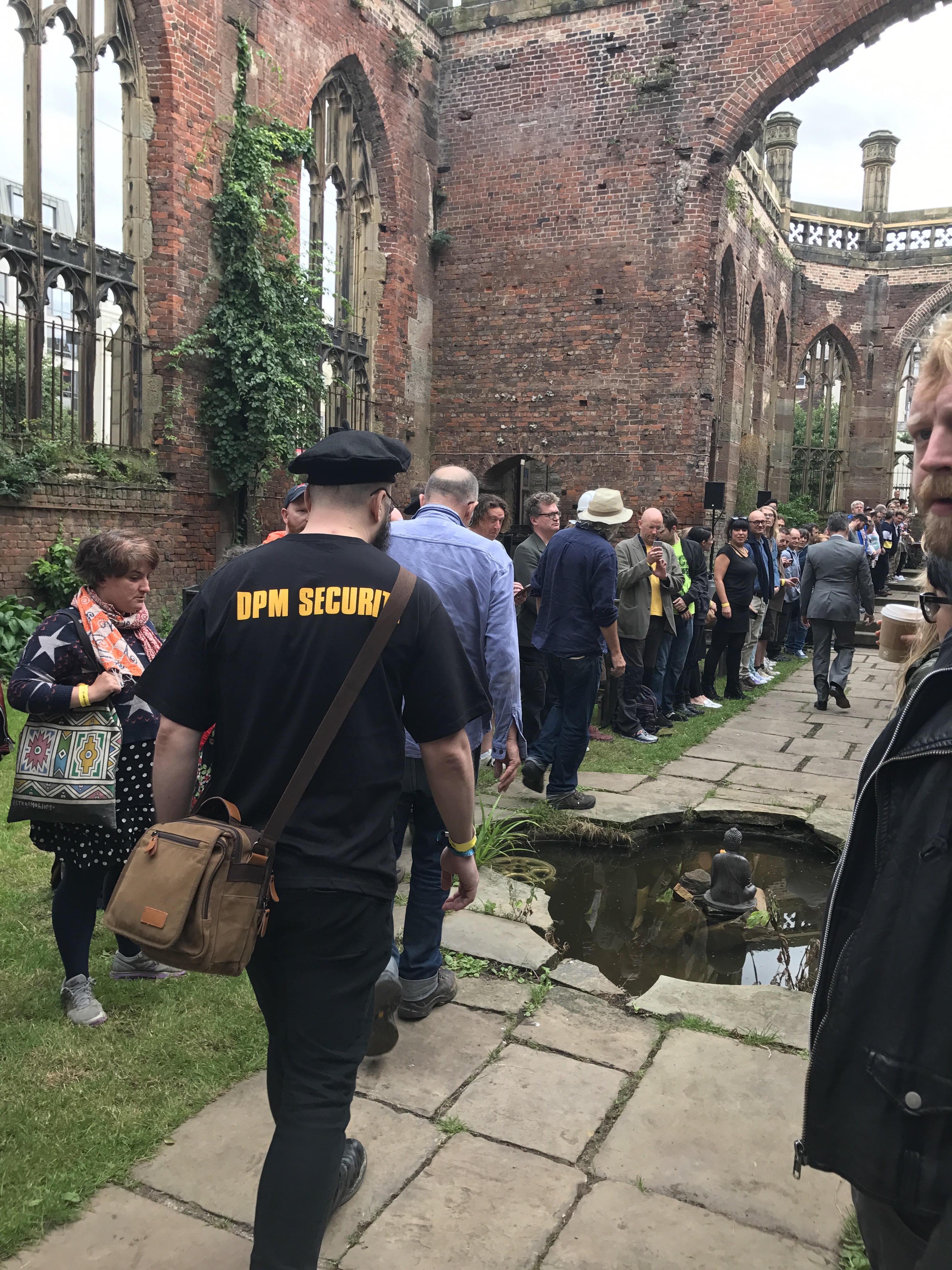 After a drive by from Ford Timelord, the chimes we had heard for the book stamping returned and we were ushered into The Bombed-Our Church and directed left or right into two long lines along the ‘aisle’.