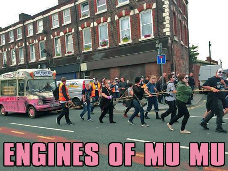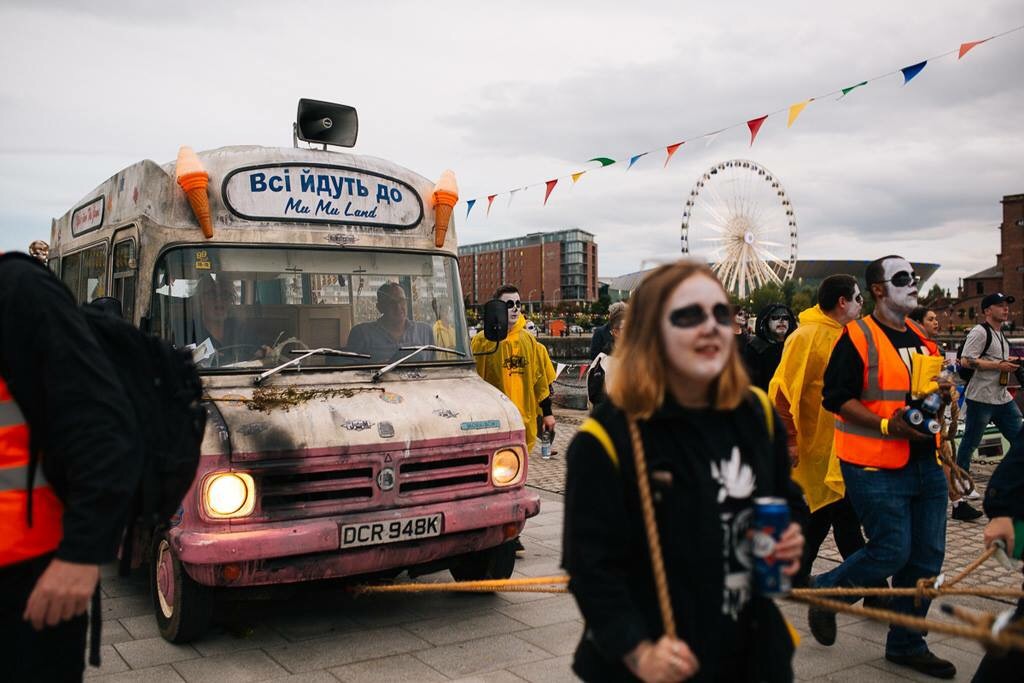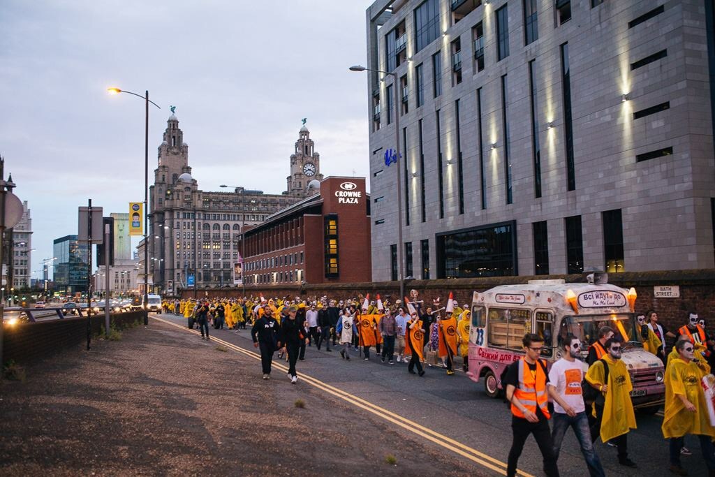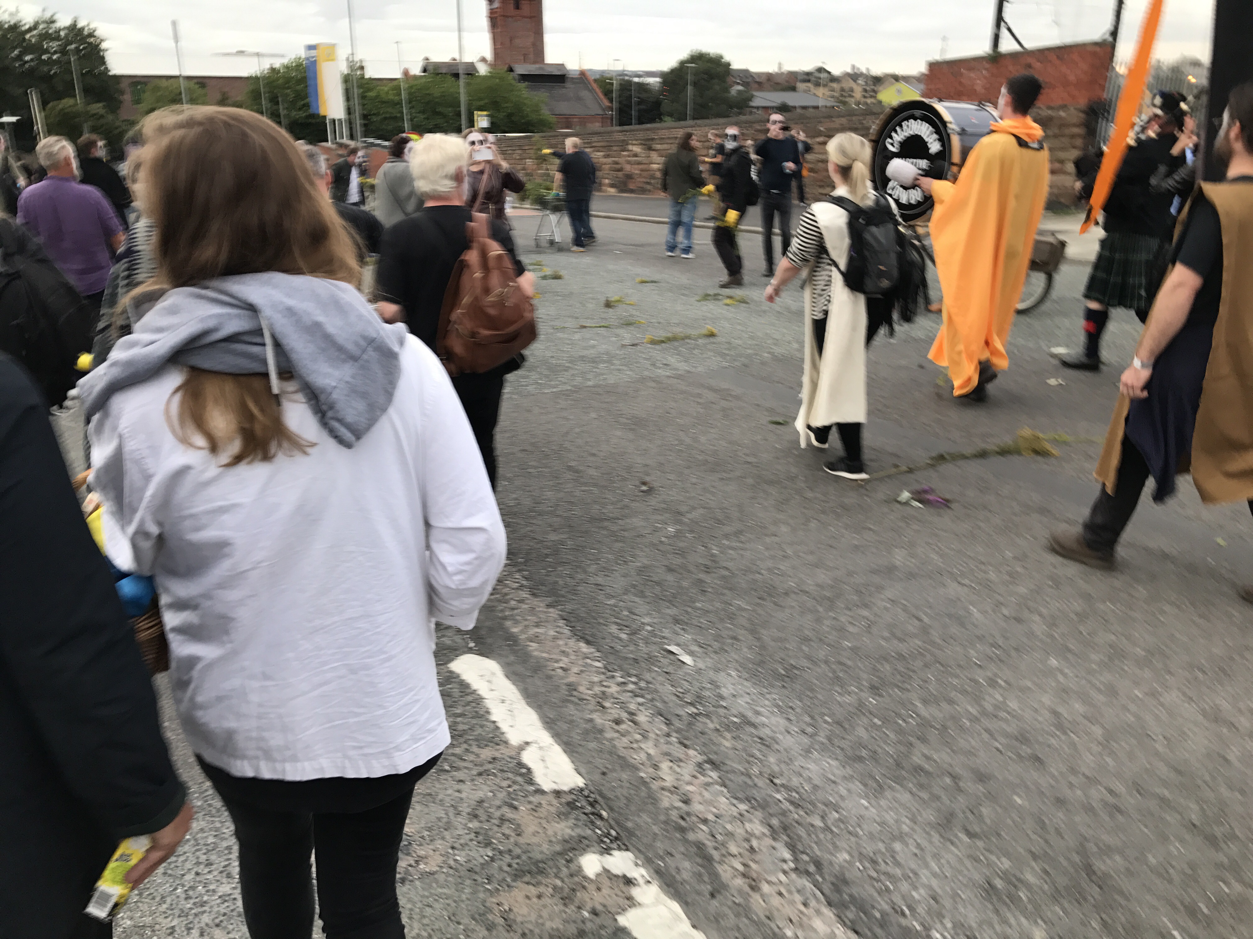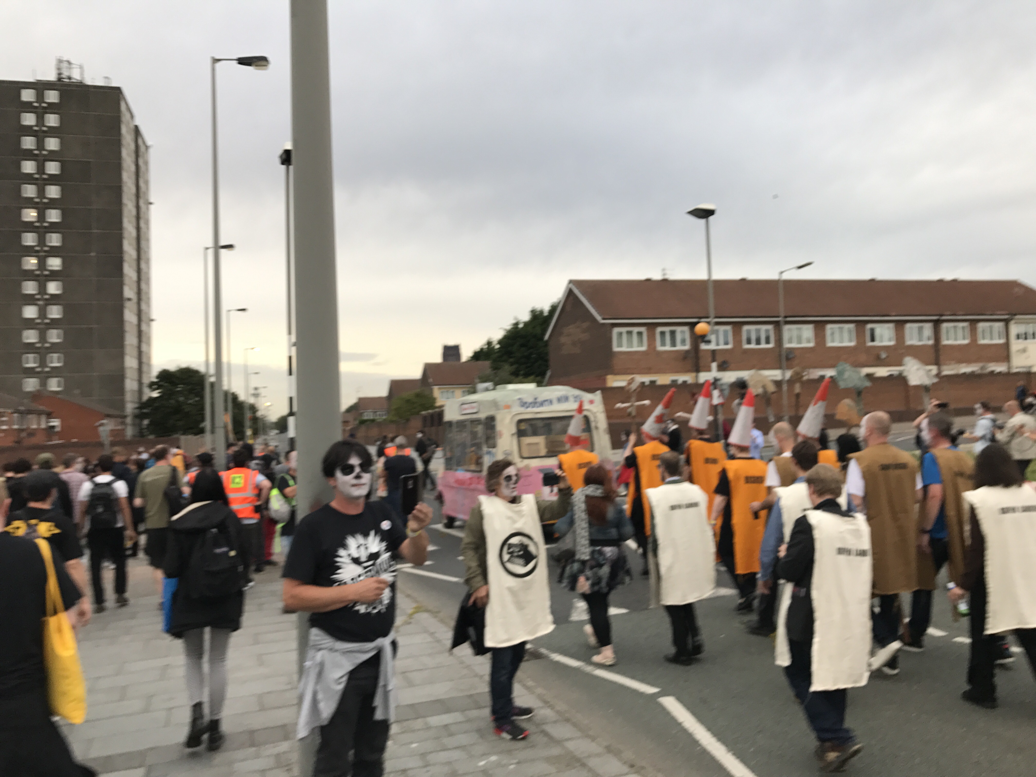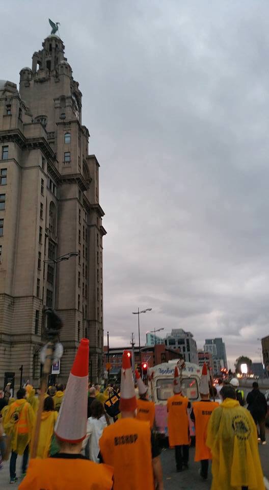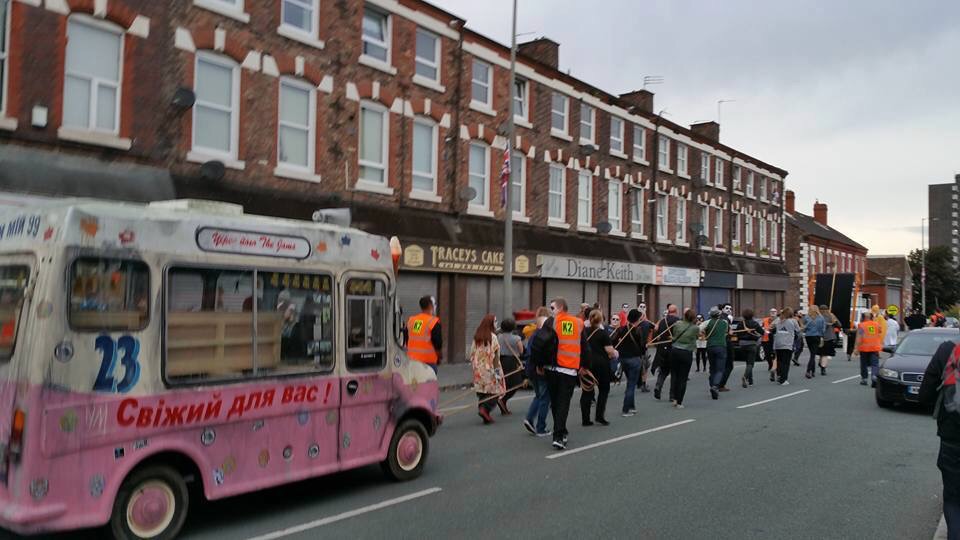 I was somewhere in the middle of this, mostly alongside the van – second best seats in the house. The mood was fantastic and we seemed to be welcomed and supported by the local residents with a mixture of amazement and confusion. Some even joined the procession including one woman who provided one of day’s highlights. As we joined The Strand, at the foot of the road out of Toxteth she skipped past with a can a Red Stripe in one hand and an active FaceTime chat in the other.