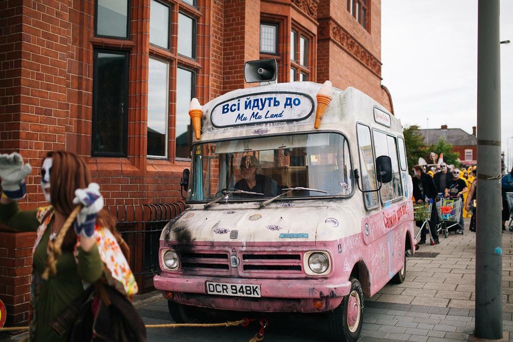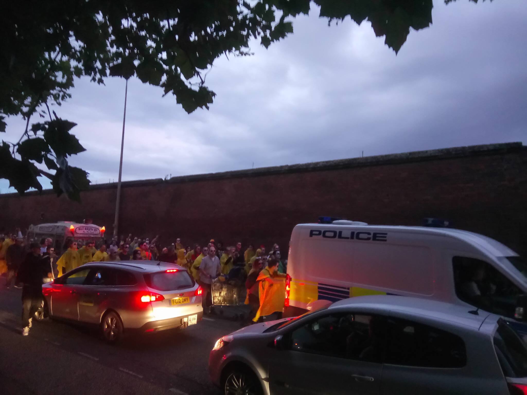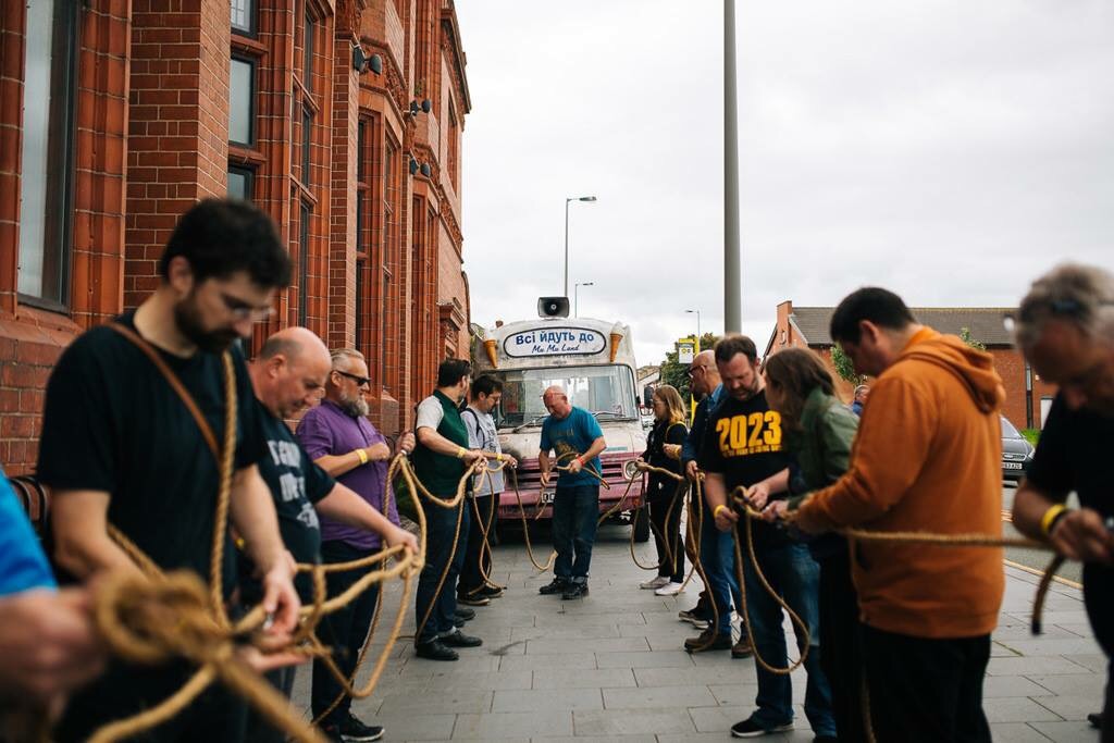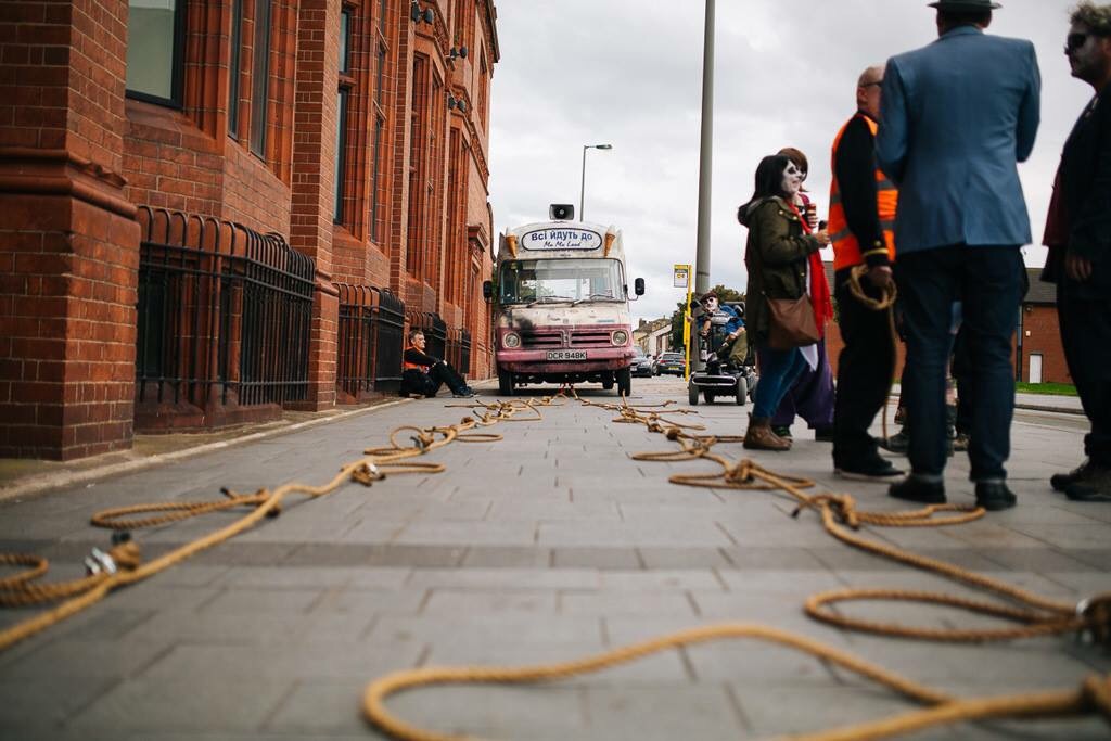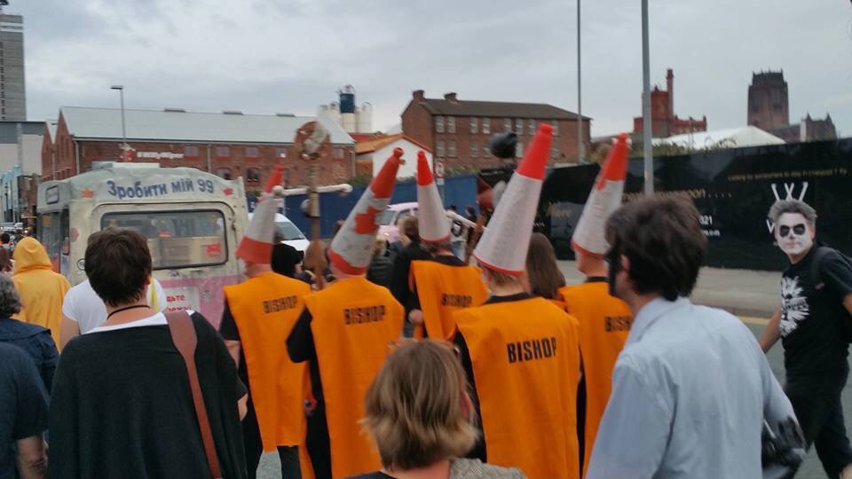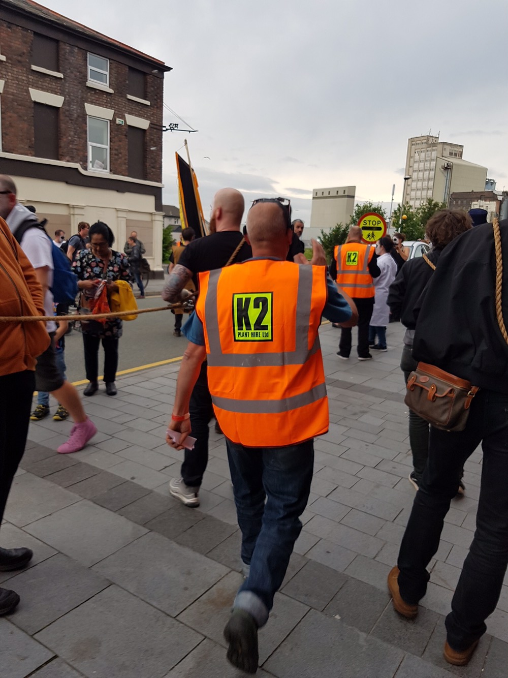 I was somewhere in the middle of this, mostly alongside the van – second best seats in the house. The mood was fantastic and we seemed to be welcomed and supported by the local residents with a mixture of amazement and confusion. Some even joined the procession including one woman who provided one of day’s highlights. As we joined The Strand, at the foot of the road out of Toxteth she skipped past with a can a Red Stripe in one hand and an active FaceTime chat in the other.