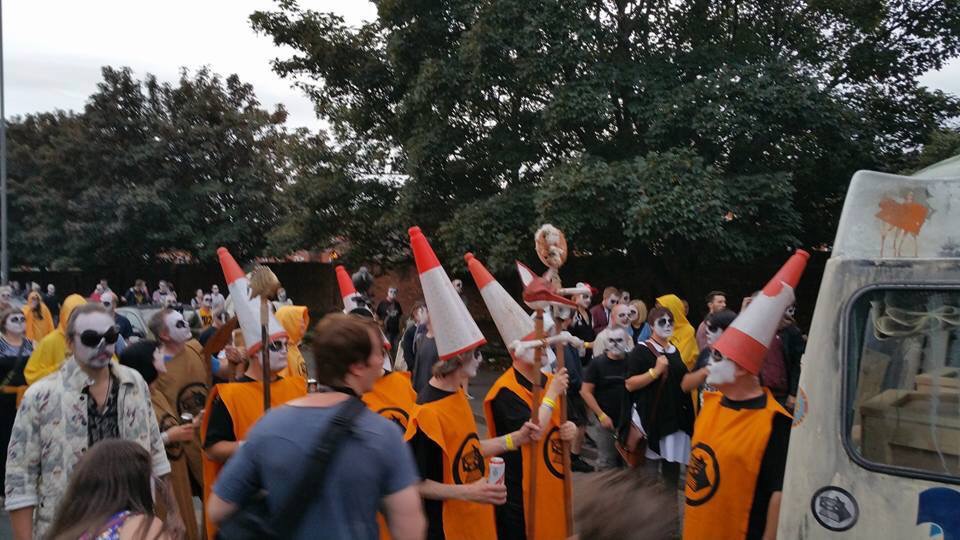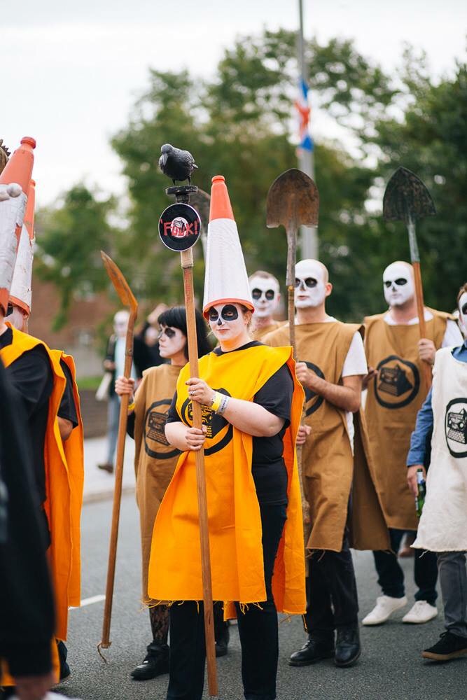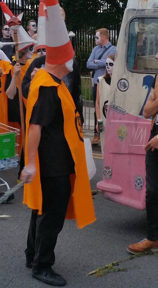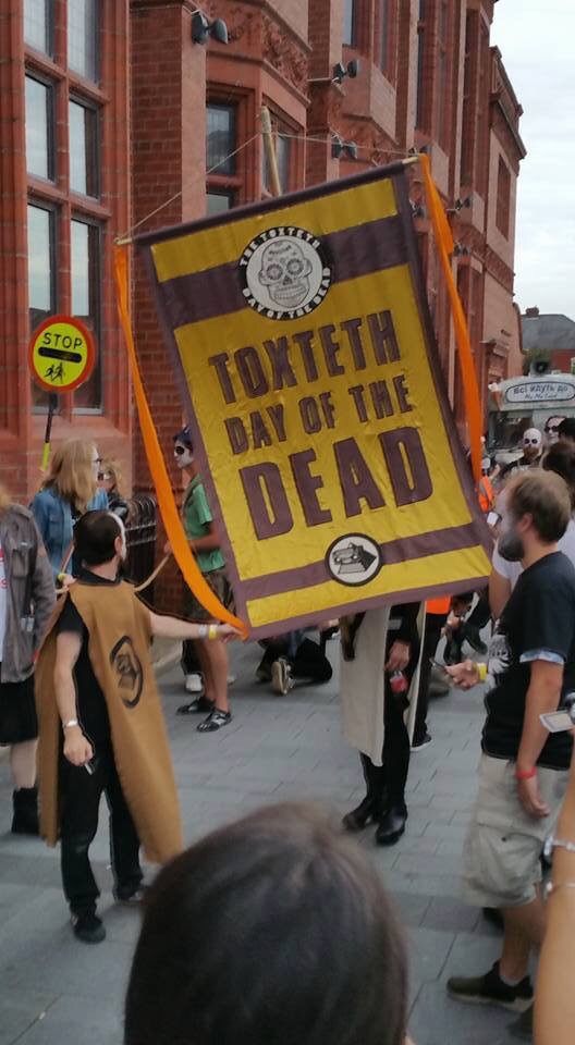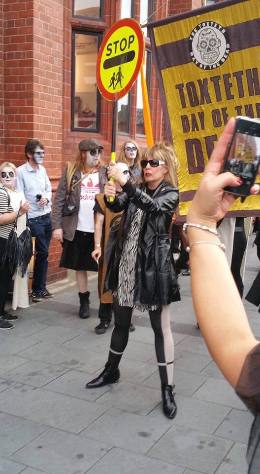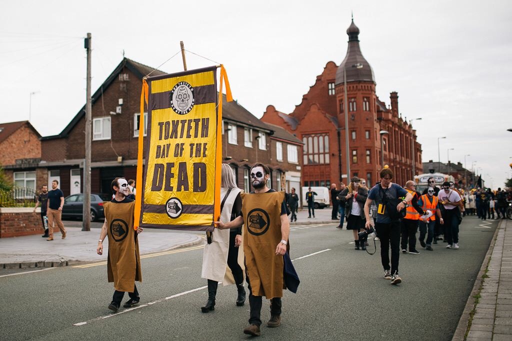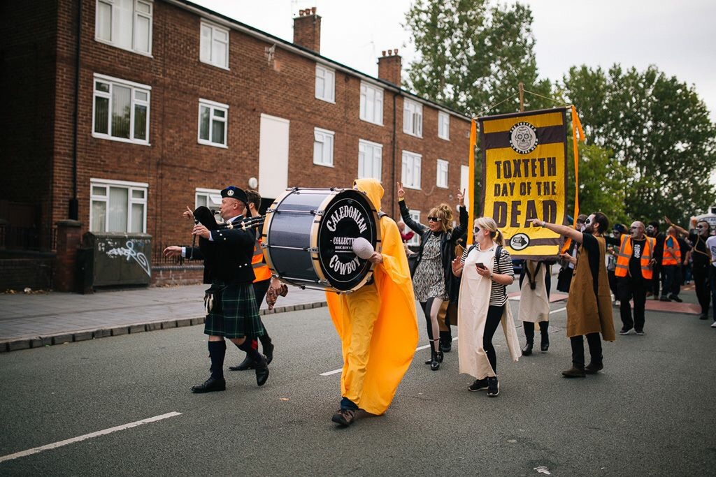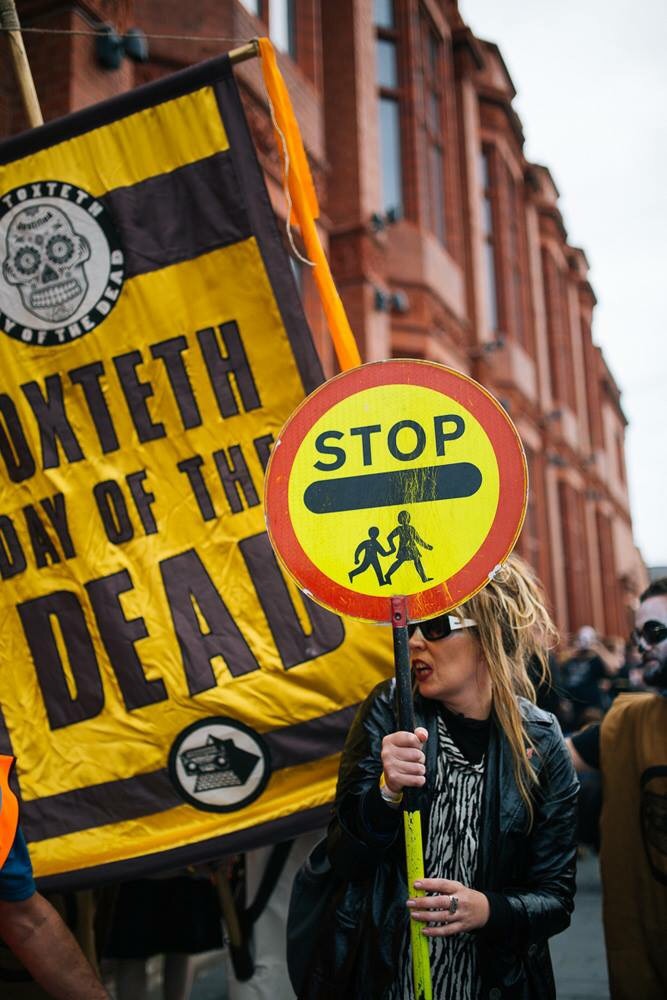 Off we went. Traffic lady first, followed by the piper and drums. In their wake came the banner carriers for the Toxteth Day Of The Dead, an incense swinger and ceremonial weed scatterers.