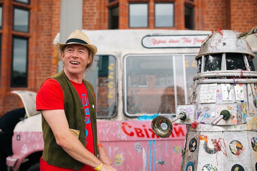 After the van were the bishops resplendent in their custom built traffic cone headgear, the gravediggers and the choir. Following up the rear were an assorted bunch of active volunteers carrying bricks on -their own – yellow cushions, spare tyre rollers and shopping trolley pushers carrying the ragwort, budlea or the bags of the volunteers. At the rear were the clean up gang picking up the ceremonial weeds with the all too necessary yellow gloves and returning it in trolleys to the front of the procession for the cycle to begin again.