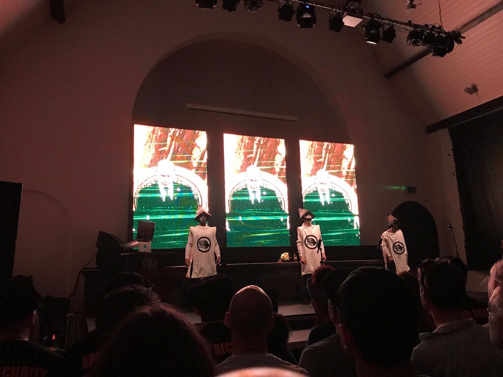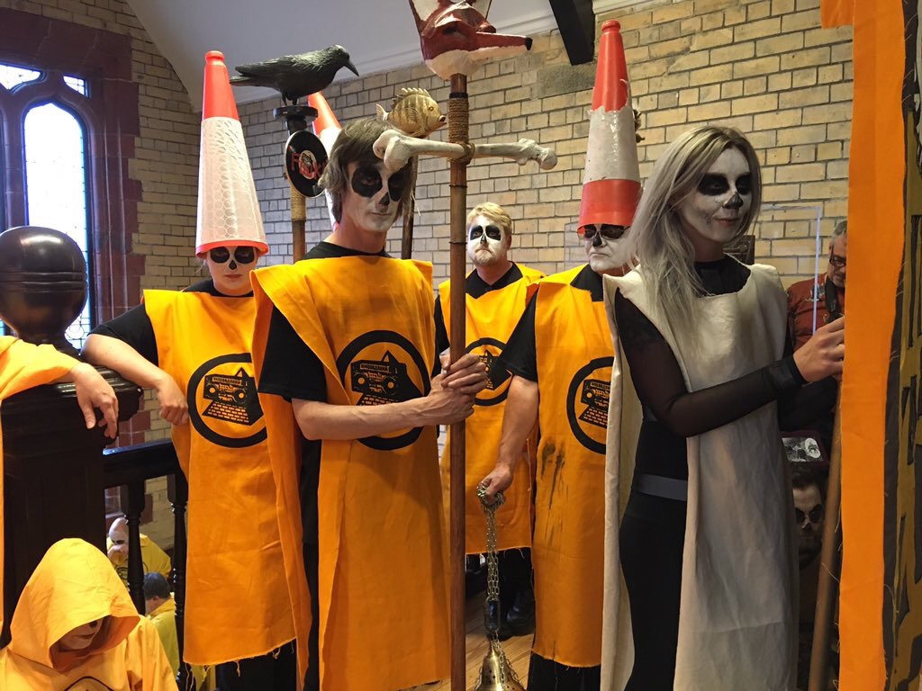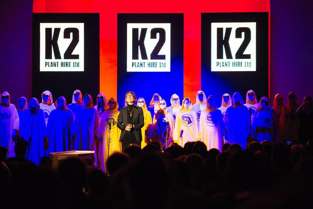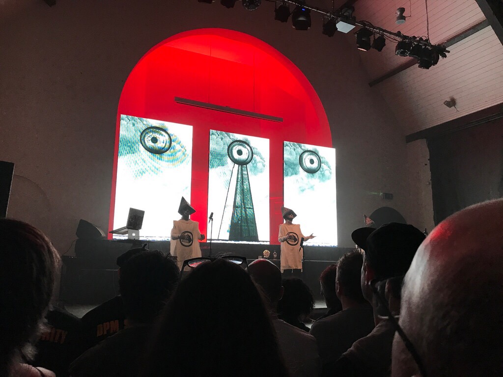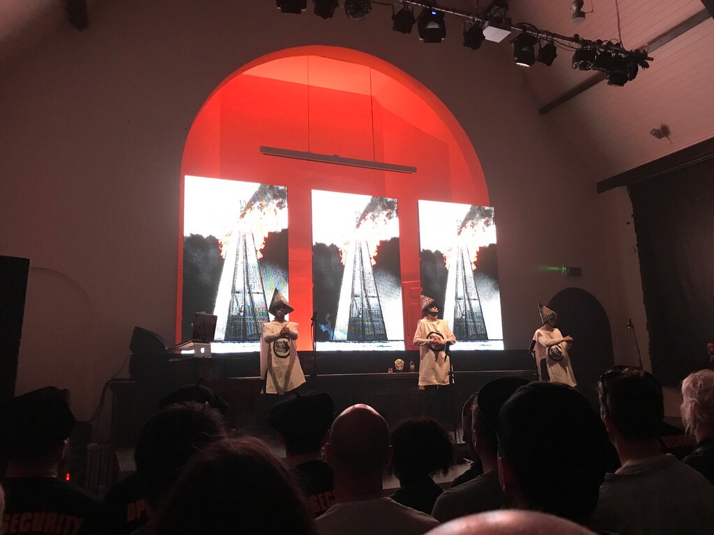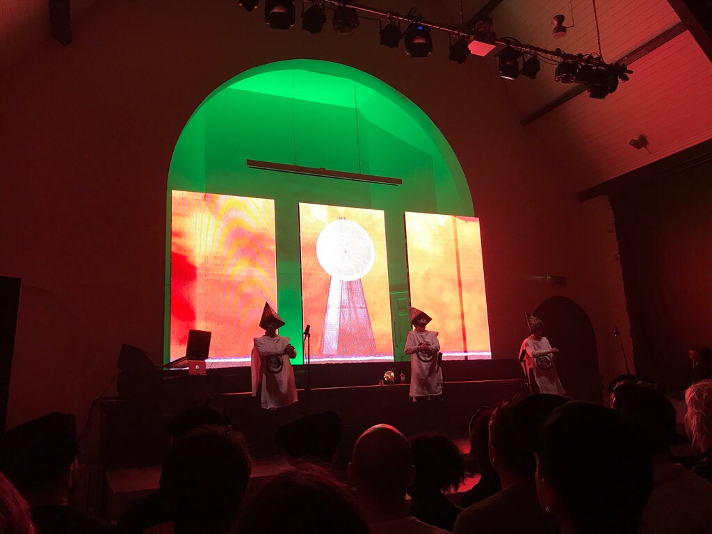 We saw echoes of Bill’s NOTICEs and his soup kitchens. Badger Kull was simply a next level version of The 17. In fact all of the volunteer jobs were. The bass rumbles upstairs in The Florrie hinted at Jimmy’s experiments with weaponised sound – there was definitely a frequency oscillator set up along with a note warning the operator to not attempt to find the resonant frequency of the room. The People’s Pyramid is a reboot of a project from the 90s. The Great Pull North married the original Rites of Mu on Jura with Bill’s workmanlike, DIY approach – the footage of him preparing bishop hats from cones is among my highlights. They painted Ford Timelord – although not their Ford Timelord – just like in The White Room. And guest stars. They’ve always liked their guest stars. From the ambushing of Sam Fox, Whitney and Petula, through ABBA, The Shangri-Las and Big Ben and finally the in the flesh Gary, Glenn and Tammy, The JAMs have stalked, sampled and seconded their heroes. The accidental revealing of Jarvis via the hymn book didn’t diminish what was a truly remarkable performance. The fact that he got the gig because he rang them at the exact moment they were considering the guest vocalist only adds to the glorious haphazard nature of the event. Jarvis played a blinder and I’m glad I got the chance to thank him personally later on at The Invisible Wind Factory.