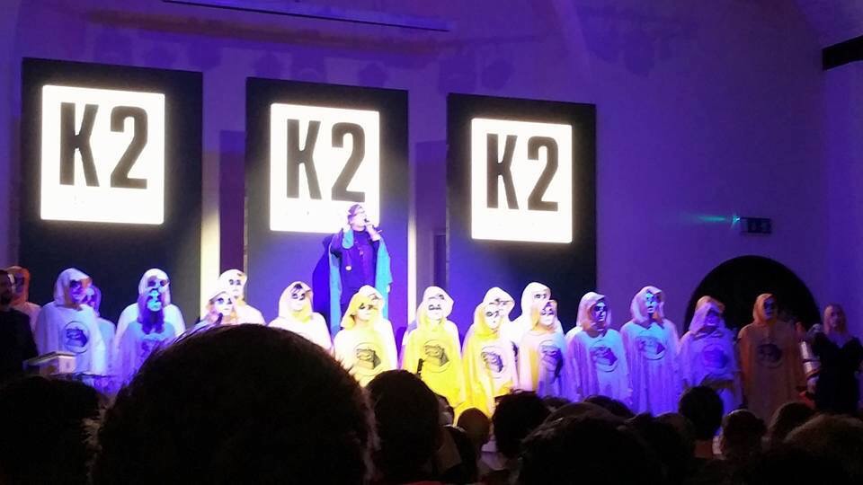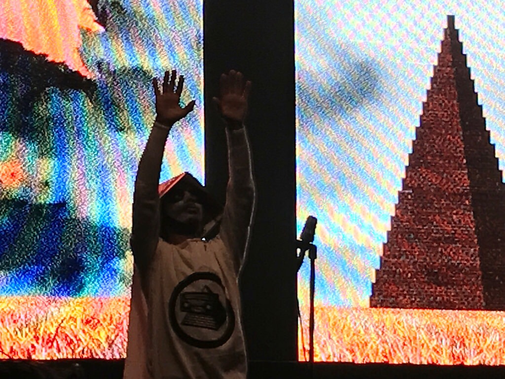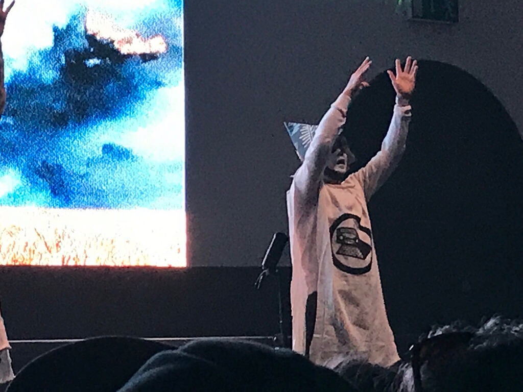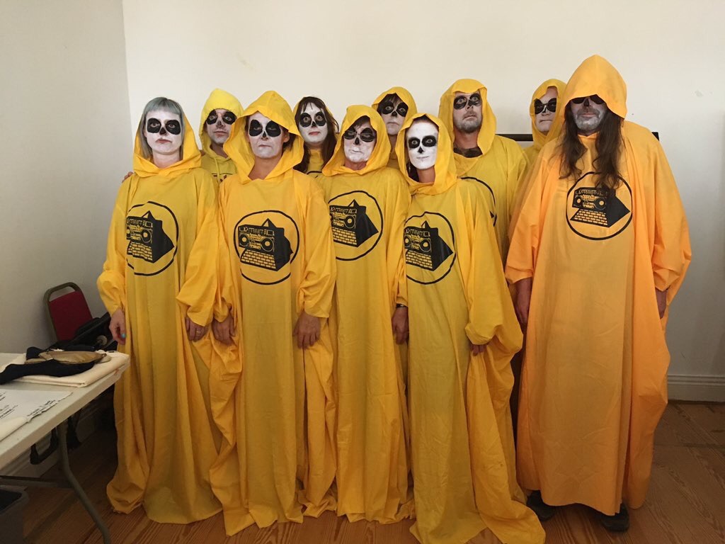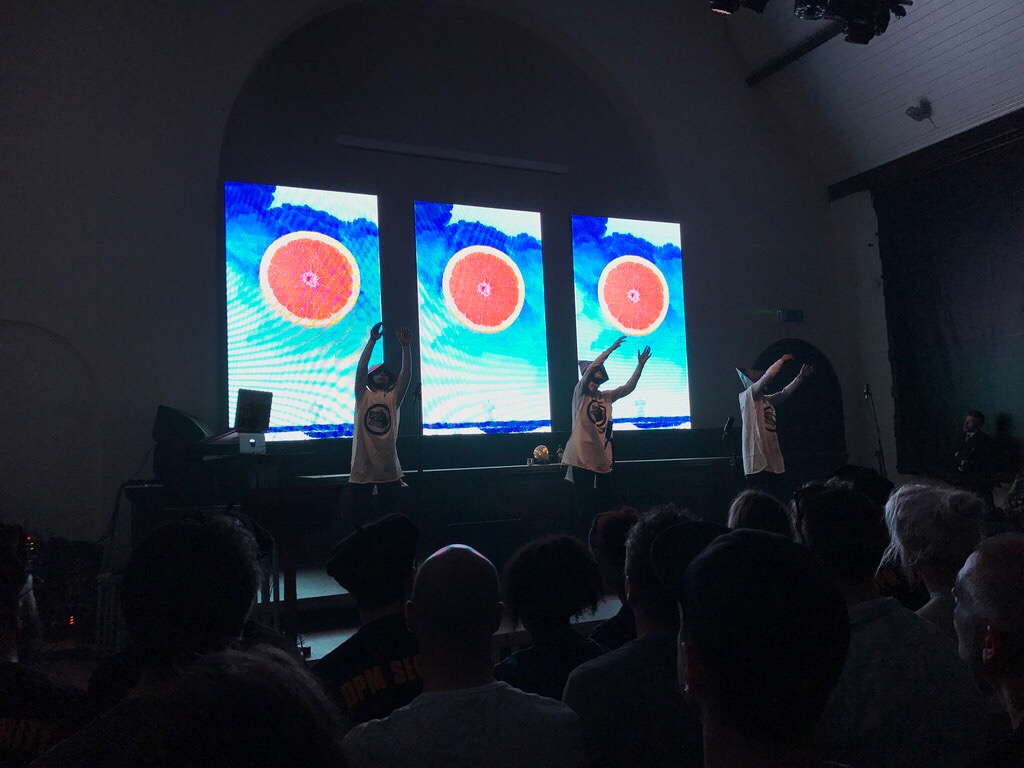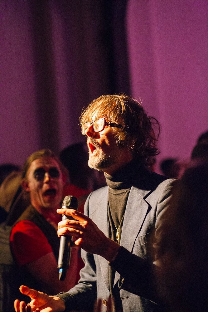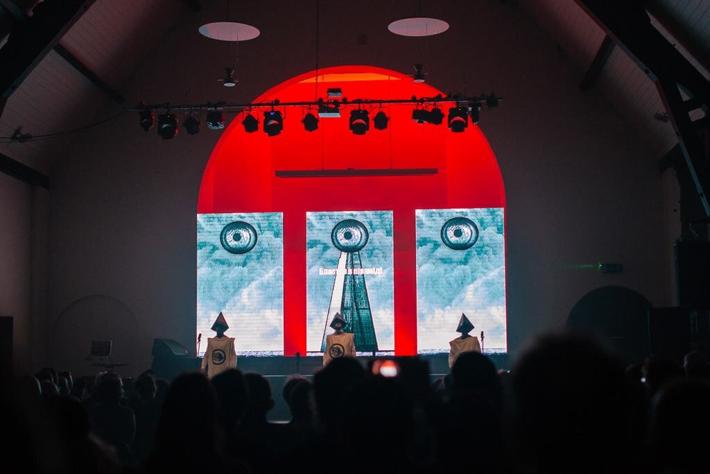 We saw echoes of Bill’s NOTICEs and his soup kitchens. Badger Kull was simply a next level version of The 17. In fact all of the volunteer jobs were. The bass rumbles upstairs in The Florrie hinted at Jimmy’s experiments with weaponised sound – there was definitely a frequency oscillator set up along with a note warning the operator to not attempt to find the resonant frequency of the room. The People’s Pyramid is a reboot of a project from the 90s. The Great Pull North married the original Rites of Mu on Jura with Bill’s workmanlike, DIY approach – the footage of him preparing bishop hats from cones is among my highlights. They painted Ford Timelord – although not their Ford Timelord – just like in The White Room. And guest stars. They’ve always liked their guest stars. From the ambushing of Sam Fox, Whitney and Petula, through ABBA, The Shangri-Las and Big Ben and finally the in the flesh Gary, Glenn and Tammy, The JAMs have stalked, sampled and seconded their heroes. The accidental revealing of Jarvis via the hymn book didn’t diminish what was a truly remarkable performance. The fact that he got the gig because he rang them at the exact moment they were considering the guest vocalist only adds to the glorious haphazard nature of the event. Jarvis played a blinder and I’m glad I got the chance to thank him personally later on at The Invisible Wind Factory.