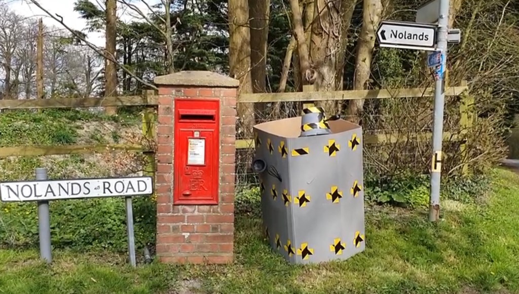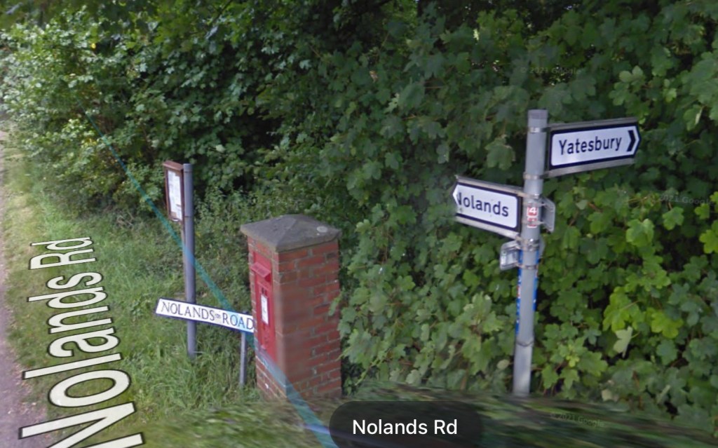 I searched the video for re-enactable moments. Most shots were aerial shots or high speed collisions between Ford Timelord and some non-kopyright-bothering ‘Daleks’, but one short scene jumped out. After driving through the Avebury stone circle, Ford Timelord takes a sharp left turn while a ‘Dalek’ observes next to a post box. I searched the surrounding area on Google Maps with just one clue: a sign pointing to a mythic place called Nolands.