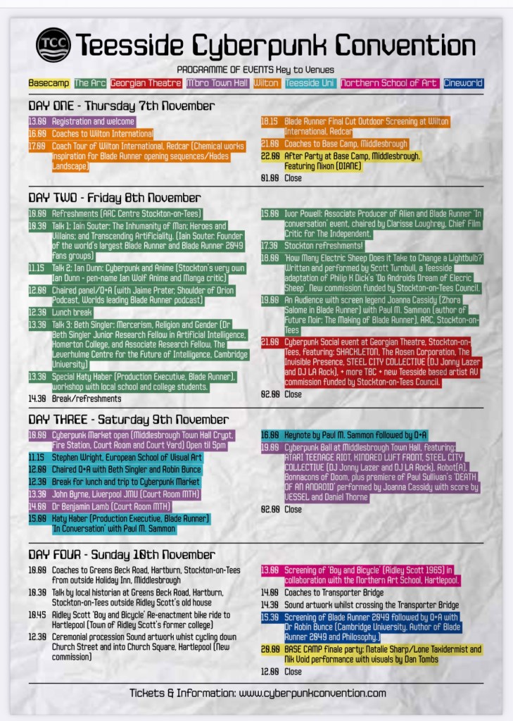 The fact that KINDRED LUFT FRONT had been scheduled for Blade Runner Weekender – but not subsequently appeared – was a big clue. After all Paul Sullivan, The Architect had a sizeable foot in both camps. LUBA LUFT was a character in Philip K Dick’s Do Androids Dream of Electric Sheep? that loosely became Joanna Cassidy’s character Zhora in Blade Runner. The rhino hinted at the rhino toy revealed as belonging to Deckard in Blade Runner 2049. Kindred harked back to Annebella Pollen’s presentation at The Black-E, on the first day of Welcome To The Dark Ages. LEXINGTON ETERNAL was clearly based on a couple of aspects of Bill’s work…