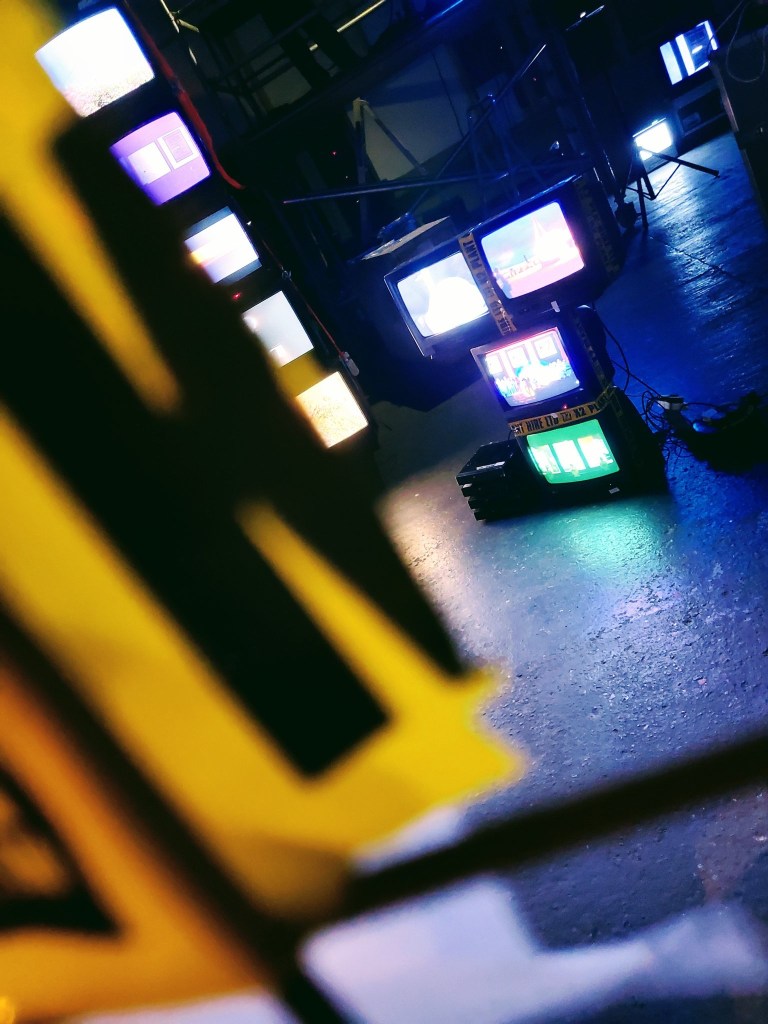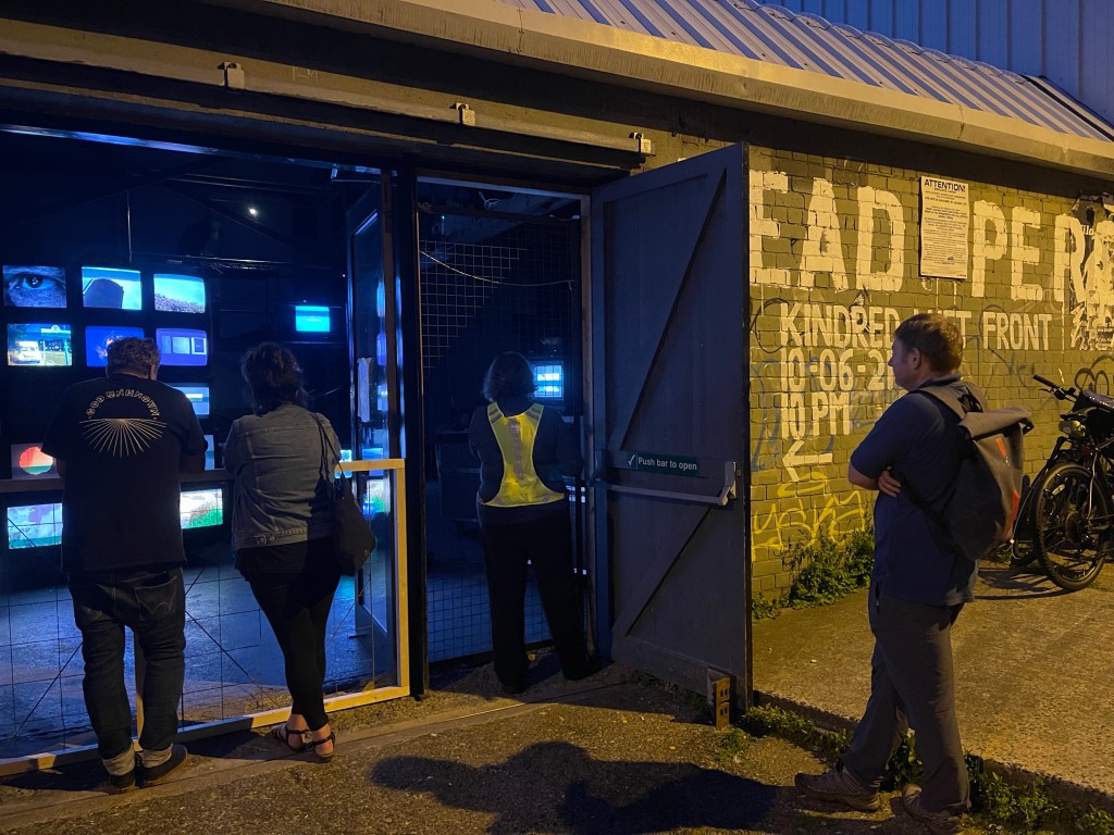 Taking our positions outside with about ten minutes to go, we were joined by a dozen more, making our numbers swell to a pleasing 23. Then at precisely 10pm, the shutters were raised to reveal a small pyramid stack of TVs and a DJ up on a gantry. The TVs were showing scenes from Blade Runner. Oh…